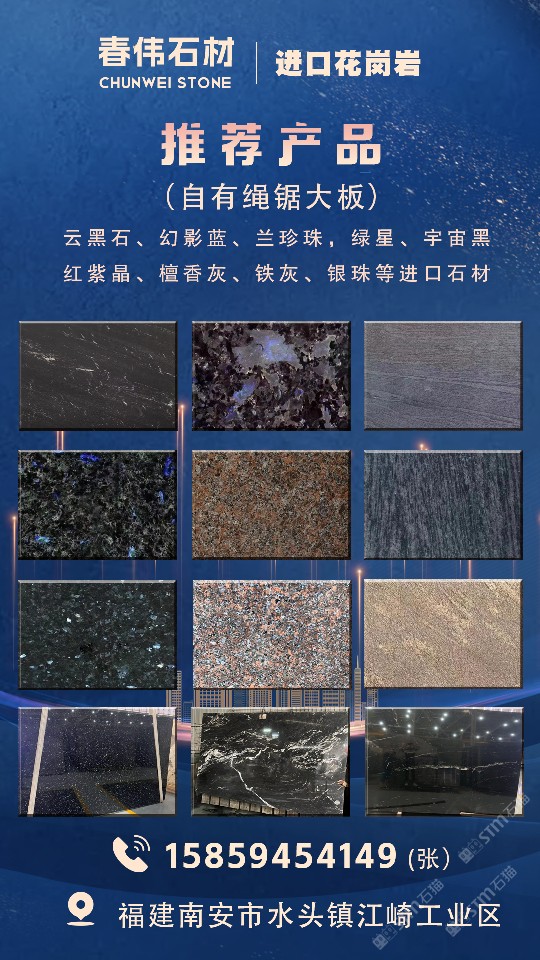 专业生产,砂锯大板,兰珍珠,幻彩虹,云黑石,七彩啡,绿星,幻彩紫,皇室啡,美国白麻,美国灰麻,加卅金麻,高绞红,红钻,树挂冰花,巴西金麻,紫点金麻,黑水晶,等各种进口石材,云黑石大板/皇室啡/绿星/蓝珍珠/巴西金麻/英国棕/树挂冰花/美国灰麻/高蛟红