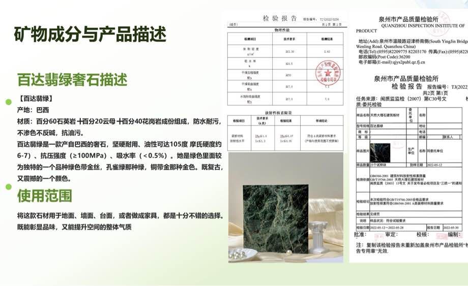 泉州时奇石业是一家集矿山、工厂、大板、展厅为一体的专业石材供应商。 一万多平方加工场地、14台红外线全自动线条机、雕刻机、水刀、24小时对外加工。 承接小区、酒店、会所、别墅等石材精装工程。 ? 您只需给我们一次机会,我们将还你一项优质工程。 我们本着“质量保障,讲求信誉,恪守合约,热忱服务,互利互惠共同发展”的企业精神,真诚欢迎石材业精英共同协作、携手前进,力求辉煌! 欢迎各地客户来人来电,洽谈订货及合作事宜。 ? 工厂地址:泉州水头滨海工业区院下时奇石业 大板销售地址:滨海大道南升市场6号门C23【绿色奢石】百达翡绿 ? 13859765964时 18965643777方