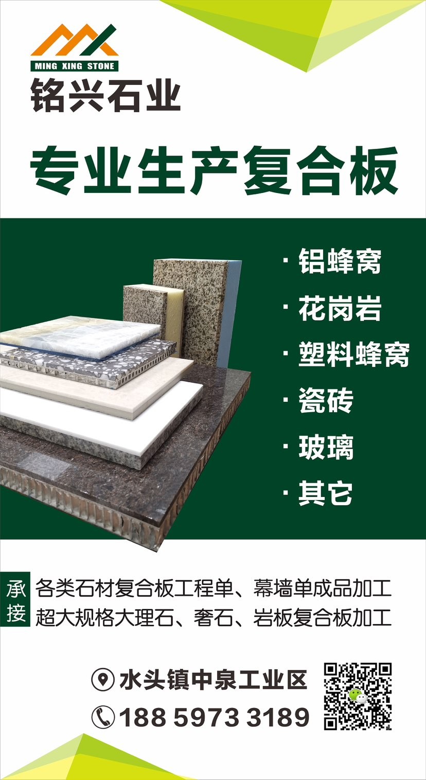 发布信息: 【铭兴复合板】专业加工各类石材复合板 1.大理石/花岗岩复合板工程单、幕墙单! 铝蜂窝板、花岗岩、瓷砖,玻纤蜂窝板,人造石、玻璃等 2.各类超大规格石材复合板 供应各类石材复合板成品,来料加工!