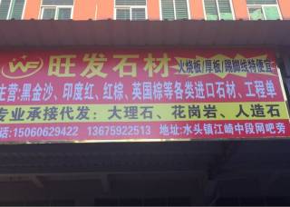 旺发石材主营产品:麦成金丝(人造石),黑金沙,黑金沙(中花),古典米黄,紫罗红,金钻,新莎安娜,G617(新矿),新安溪红,G623,银珠,银珠3,新654,粗花654(荔枝面),新654(ZZ矿),浪花红,新中国黑,水景企业地址:福建南安水头海联广场附近